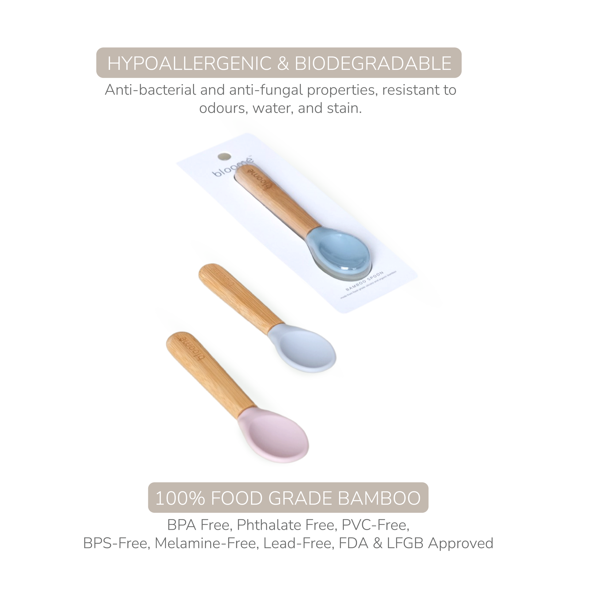 Bloome Bamboo Spoon is designed ergonomically. Larger spoon head would help babies to pick up food, and shorter spoon handle would fit perfectly in their little hands. Our silicone spoon is gentle on babies’ tender gums. Natural bamboo is a lightweight yet durable material.