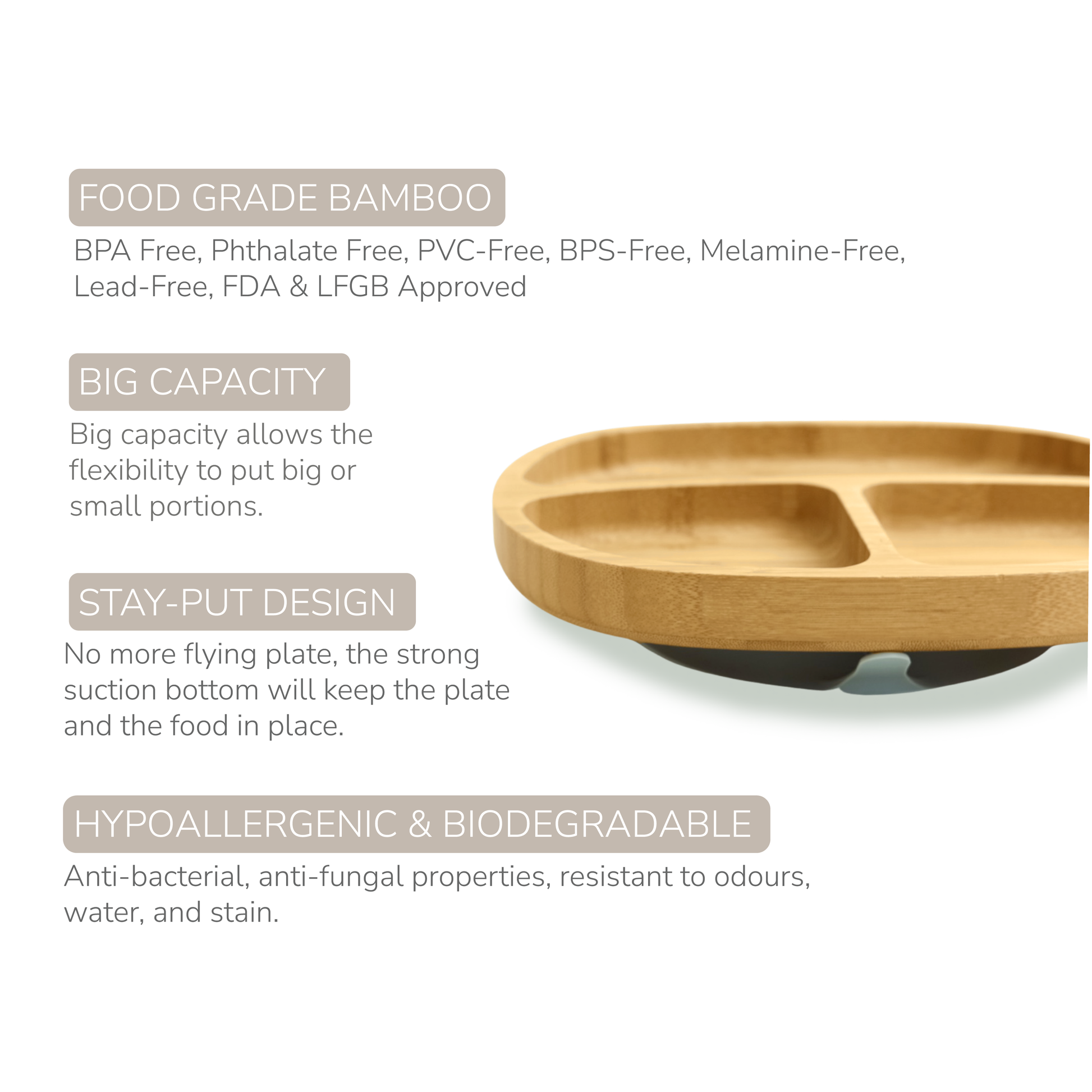 -THREE PERFECTLY PORTIONED COMPARTMENTS: With 3 portioned compartments, this Classic Bamboo Suction Plate is suitable for baby-led weaning and the picky eaters.