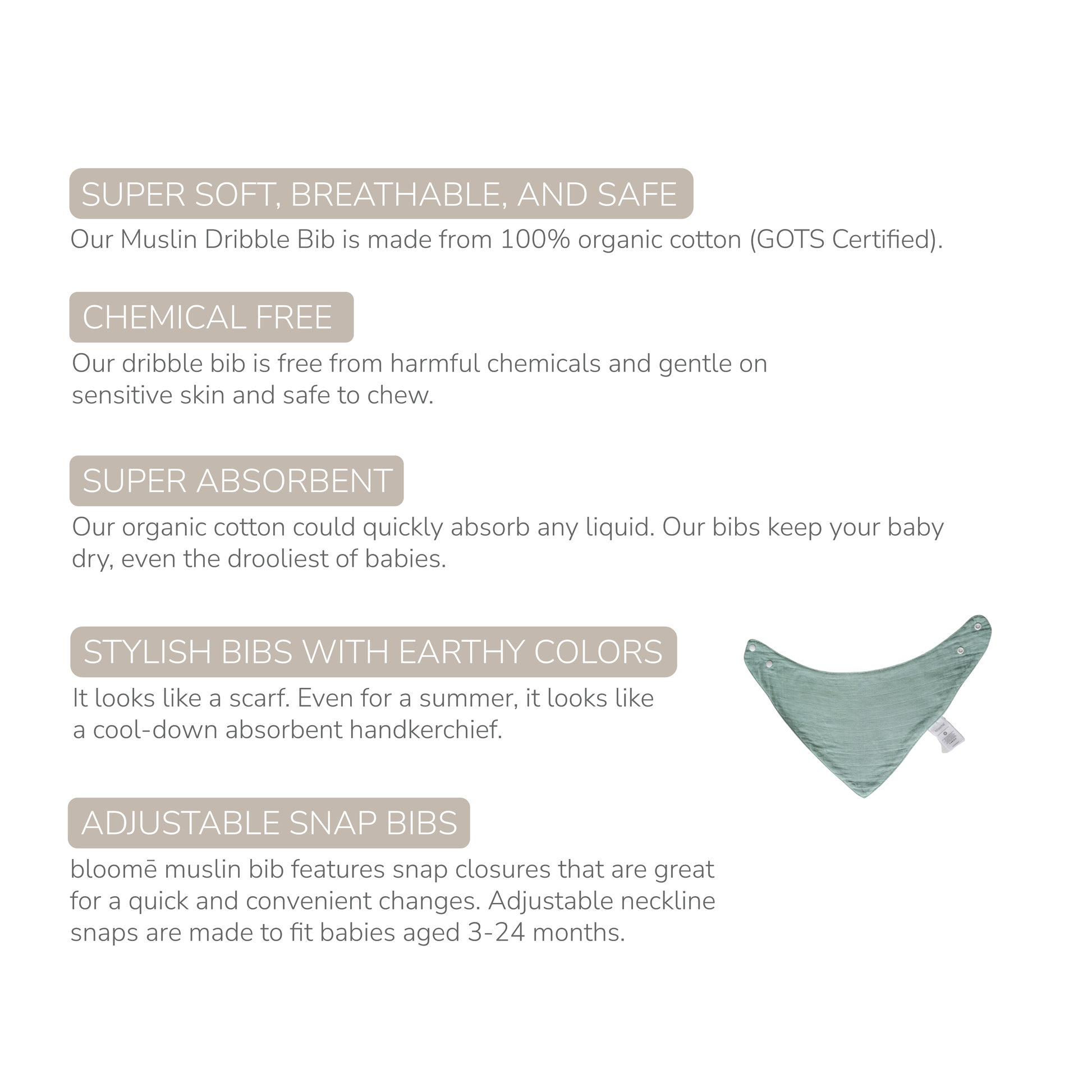 -ADJUSTABLE SNAP BIB: Bloomē Muslin Dribble Bib features snap closures that are great for quick and convenient changes. Adjustable neckline snaps are made to fit babies aged 3-24 months.