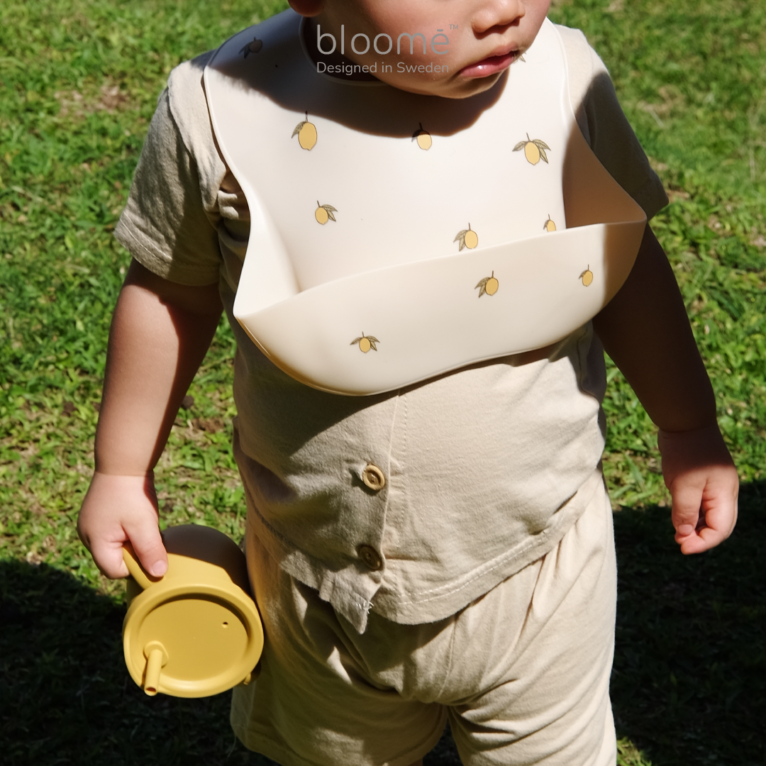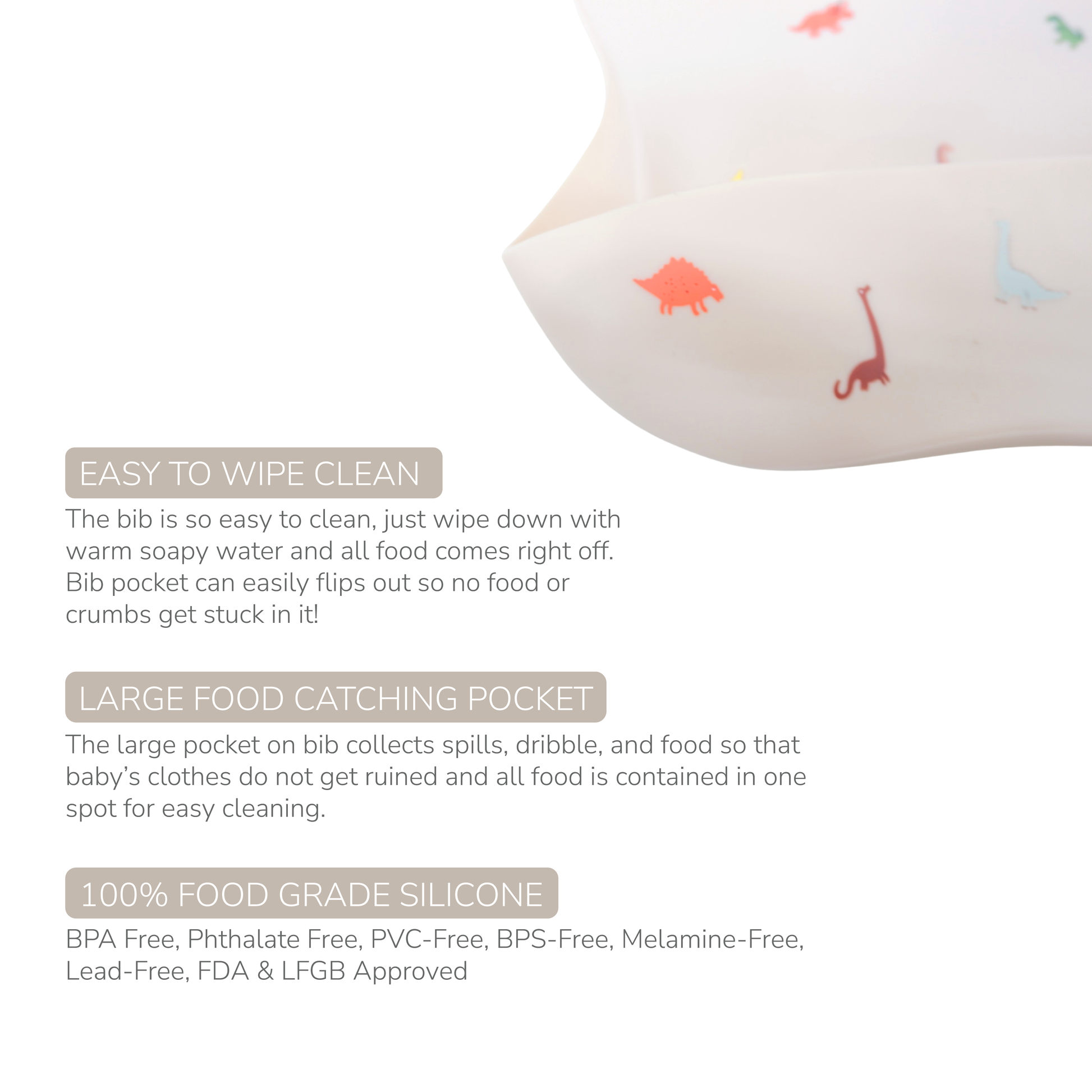 -EASY CLEANING: The bib is so easy to clean. Just wipe it down with warm soapy water and all food comes right off. The bib pocket can easily flips out so no food or crumbs get stuck in it.