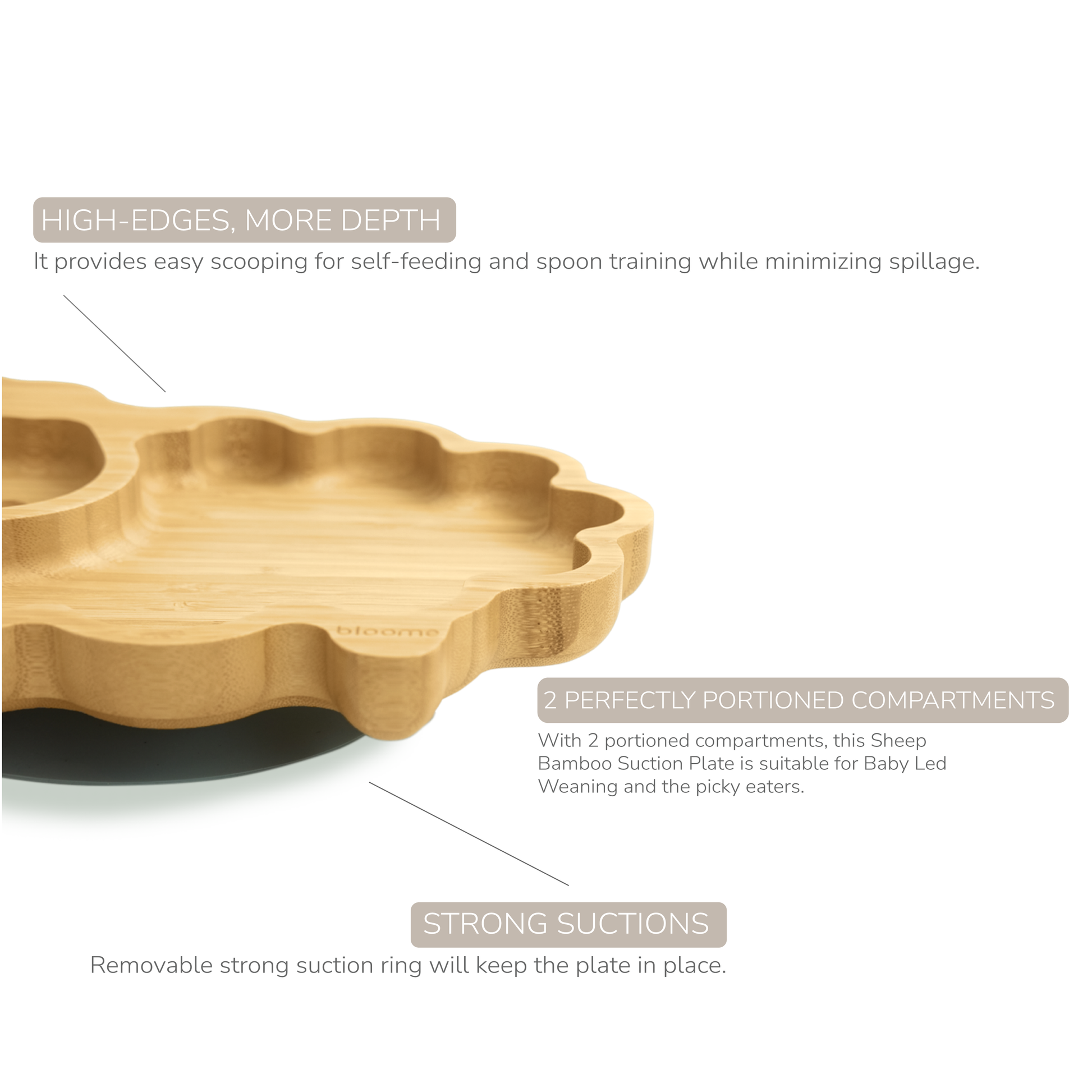 -THREE PERFECTLY PORTIONED COMPARTMENTS: With 3 portioned compartments, this Sheep Bamboo Suction Plate is suitable for baby-led weaning and the picky eaters.